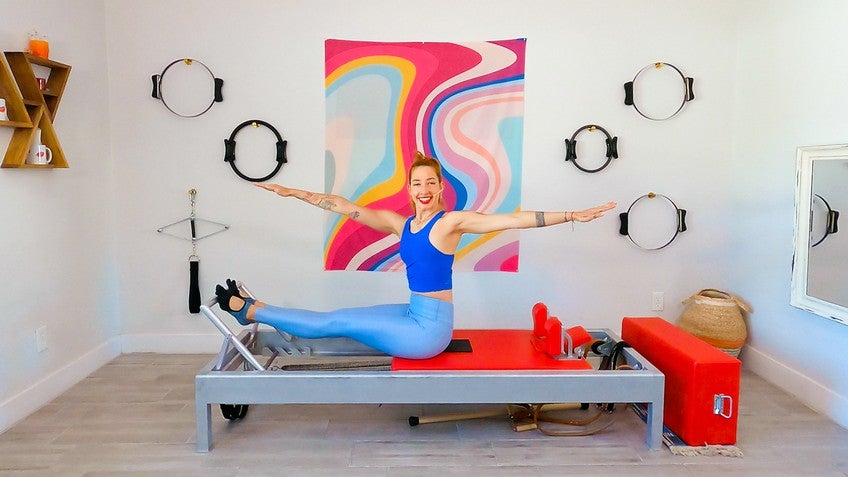 Hi, I'm Lesley Logan and today we're doing an intermediate reformer workout where we're gonna connect to our thass. So if anything doesn't work for you, feel free to replace it with something we've already done that does and let's get moving. We're gonna start with our footwork on one spring. So one heavy spring. If you're using different colored springs, I would definitely consider your heaviest spring or the next one down.