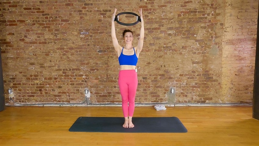 Now let's start with the magic circle, which is perfect for this that I'm talking about. So I want you to start down here nice and tall, and you engage the circle, hold, and release. And again, you pull, pull, pull, hold it tight, and release. And again, engage the circle, stay tall, easing the neck and the face, and release. Now let's change the level, we go up in front of the chest and we do the same thing.