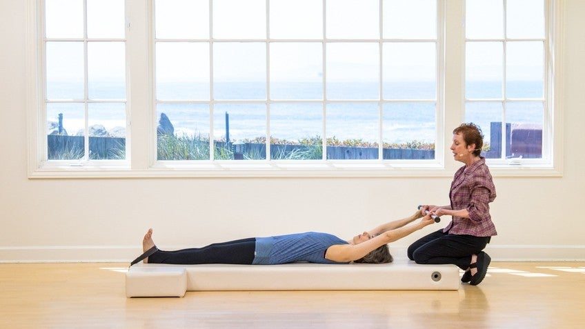 Perhaps the most well known and versatile of all the Pilates props, this deceptively simple tool has endless uses. A Circle held between the ankles, thighs, or palms is a useful tool for finding the mid-line, an important Pilates principle (think of the phrase “drawing in and up”). The Magic Circle can also create instability (the same way an Overball does) when balanced on the floor beneath an outstretched hand in the Side-Lying, or Side Kick Kneeling, or under the ankle of the stationary leg in the One Leg Circle. There’s also an entire standing series performed with the Circle placed above and between the ankle bones — a major balance challenge.