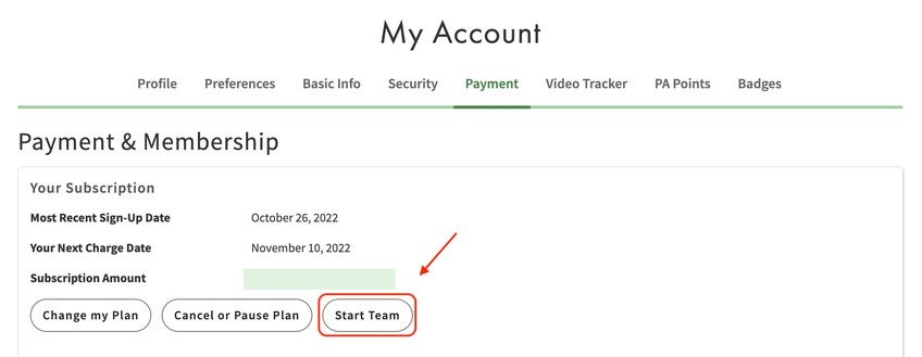 If you already have an account with us and want to change to a Team Membership go to My Account > Payment & Membership > Start Team.