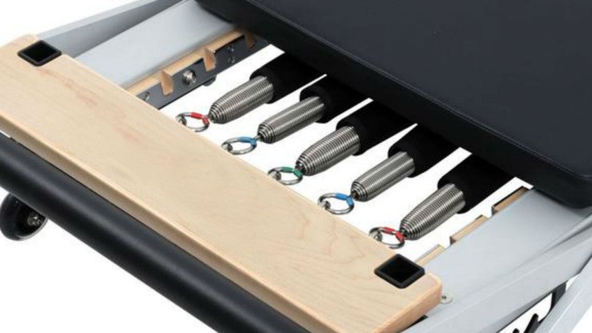 Pilates equipment uses springs with varying degrees of tension that are connected to one side of the Reformer. The springs provide both resistance and support for your exercises. The number and strength of springs vary from exercise to exercise, and the springs on the equipment can vary depending on the equipment manufacturer.